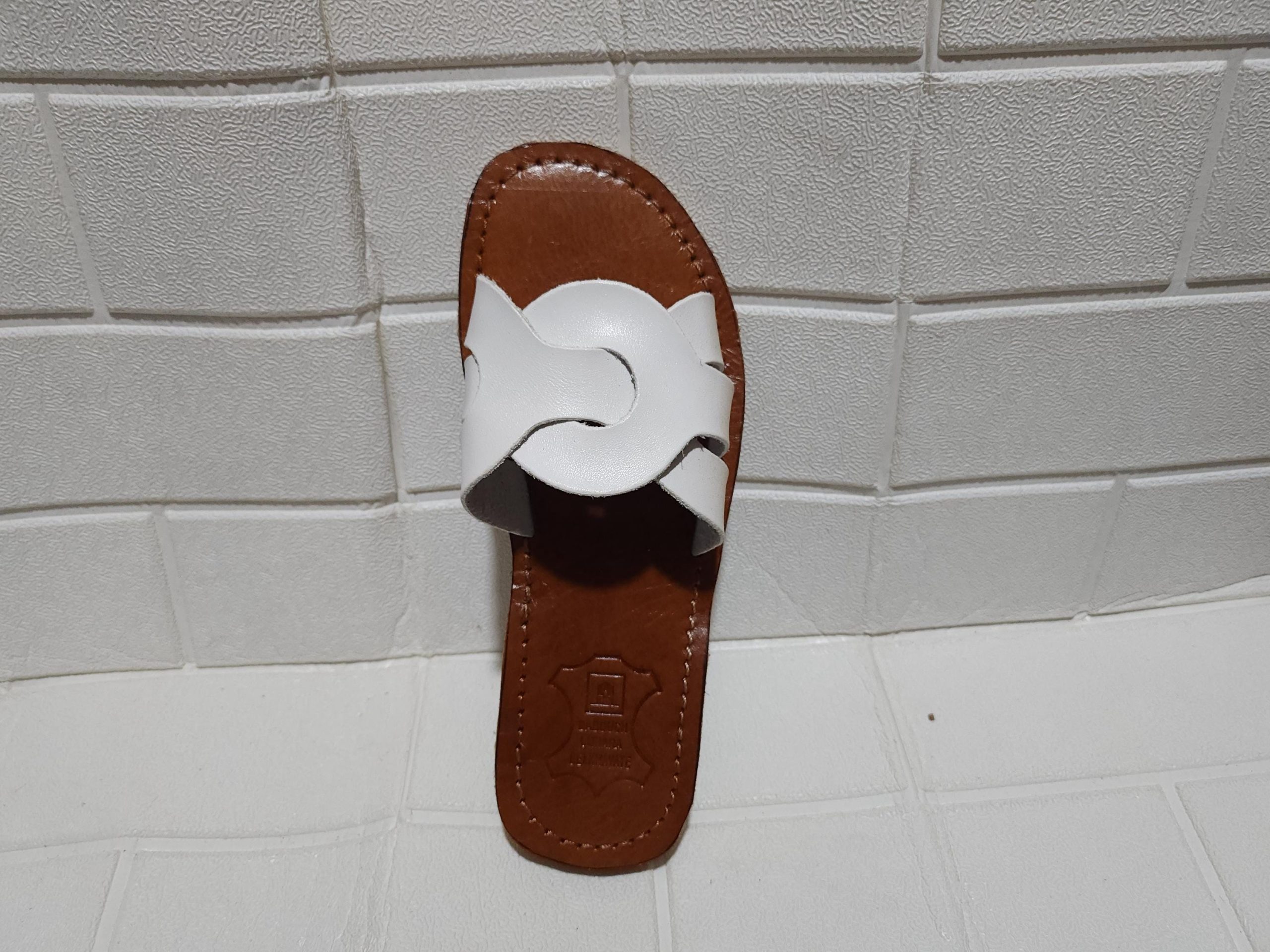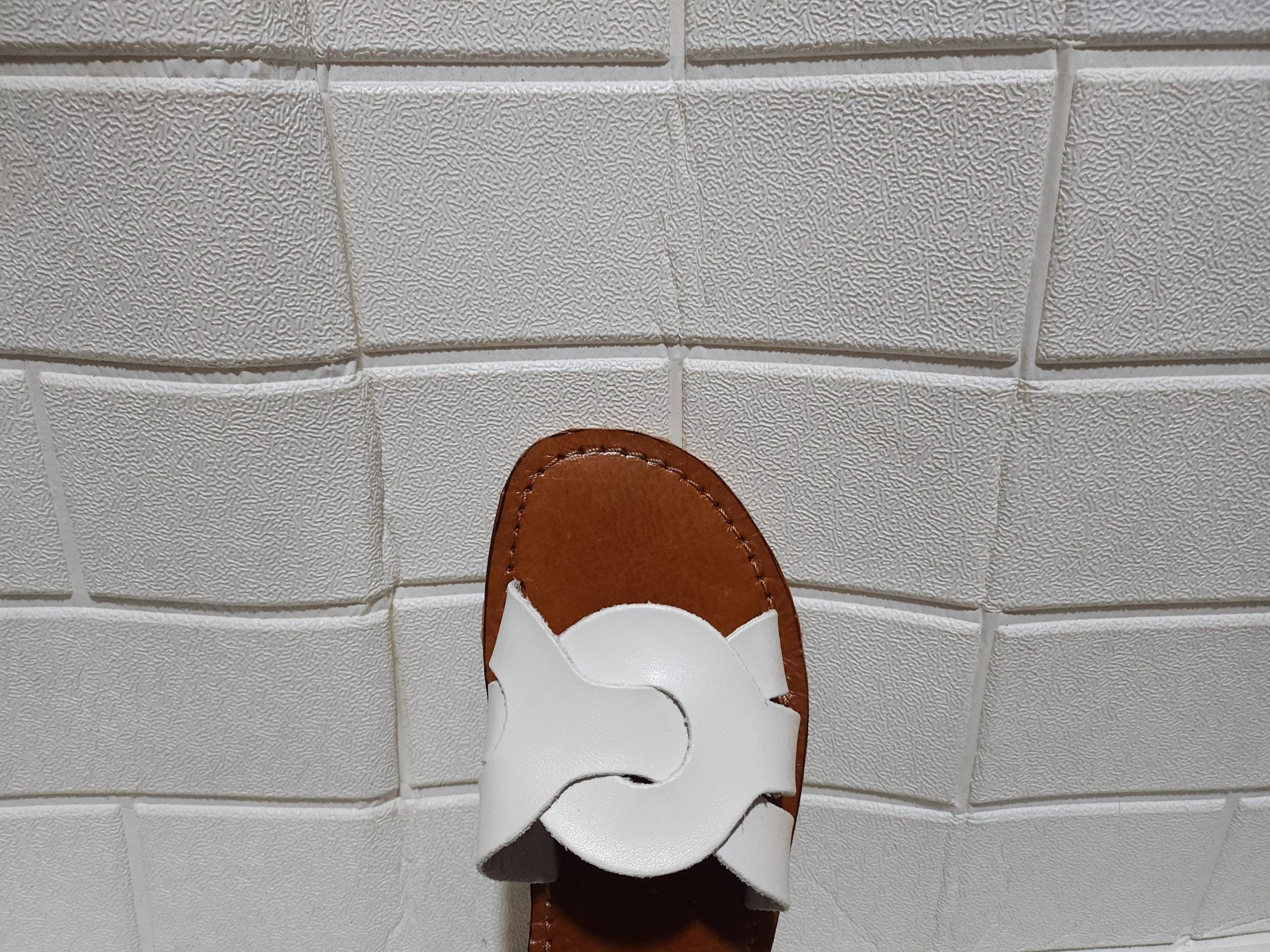 Handmade Moroccan White Leather Sandals For Women – Flat Slip-on Summer Shoes With Interlocking Strap – Artisan Minimalist Brown Sole Slides